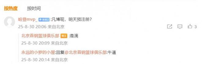 直播吧8月30日讯 北京男篮今天在官博上宣布,球队新赛季国内球员注册已经完成。有网友询问是否明天会给曾凡博预注册,北京男篮官博回复:“是滴。”