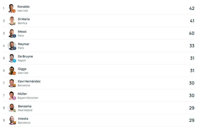 - 欧冠 | 欧冠历史助攻榜:德布劳内进前5,C罗居首梅西第三