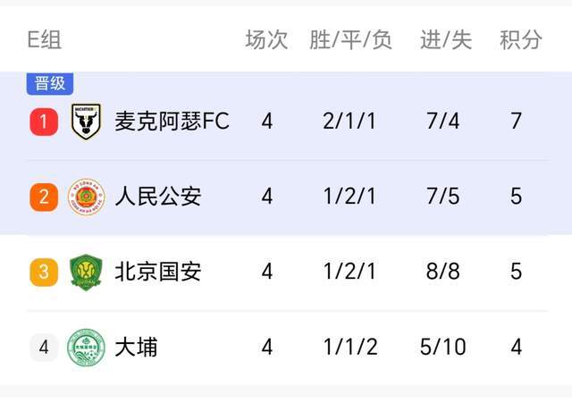 随着第4轮的结束,E组最新积分榜也发生变化,此前排名垫底的国安,取胜之后积分来到5分,追平了人民公安队,小组赛还有最后两轮,希望北京国安再接再厉,一举出线!