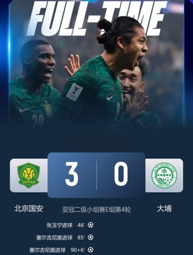 最终,经过90分钟激战,坐镇主场的北京国安队3-0击败港超球队大埔,取得亚冠二级联赛首胜。