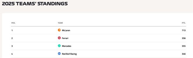 目前在车队积分榜上,法拉利以1分的微弱优势力压梅奔排在第二位。在最近几站比赛中,法拉利与梅赛德斯车队就积分榜第二的位置展开了激烈争夺,当然也不能忽视排名第四的红牛,他们与法拉利的积分差距也只有10分。