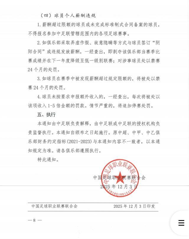 - 中超 | 中足联:中超年支出不超过6亿、国内球员限薪500万、阴阳合同将被罚降级