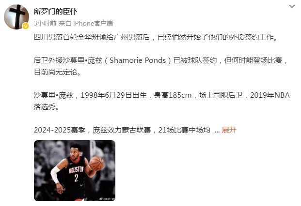 如今根据媒体人所罗门的臣仆报道:“四川男篮首轮全华班输给广州男篮后,已经悄然开始他们的外援签约工作。NBA落选秀后卫外援沙莫里-庞兹已被球队签约,但何时能登场比赛,目前尚无定论。”庞兹是一位27岁的后卫,身高185cm,是2019年NBA落选秀。2024-2025赛季,庞兹效力蒙古联赛,21场比赛场均得到22.9分6.1篮板4.3助攻3.3抢断,2分命中率58.9%,3分命中率31.6%,罚篮命中率89.6%。