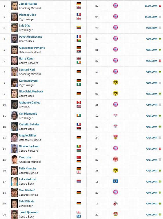 - 德甲 | 德甲身价更新:穆西亚拉1.3亿欧与奥利塞并列第一,凯恩6500万欧