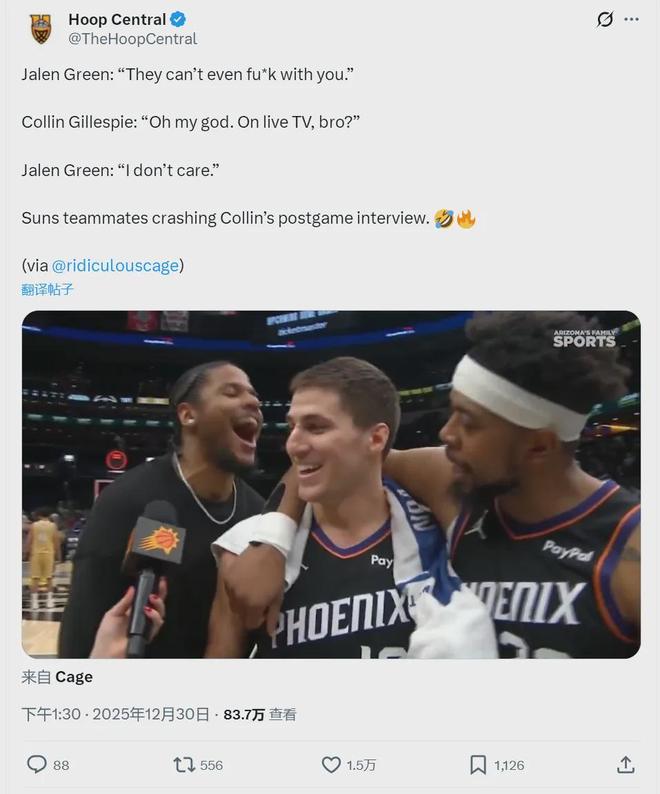 咱们要写的不是杰伦-格林,而是他的队友吉莱斯皮。格林之所以激动爆粗,主要是吉莱斯皮打得太好了:太阳上一场115-101击败奇才,吉莱斯皮14投10中,砍下25分4板6助2断!最近3场比赛,吉莱斯皮场均19.3分4.7板7.3助。