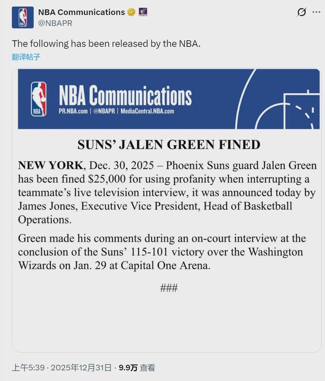 北京时间12月31日,NBA官方宣布:太阳后卫杰伦-格林在电视直播采访时使用不当言辞,被联盟罚款25000美元。事情是这样的:队友吉莱斯皮接受采访时,格林打断他并说道:“They can’t even f**k with you!”因为这次爆粗,格林被罚。